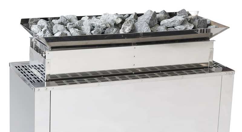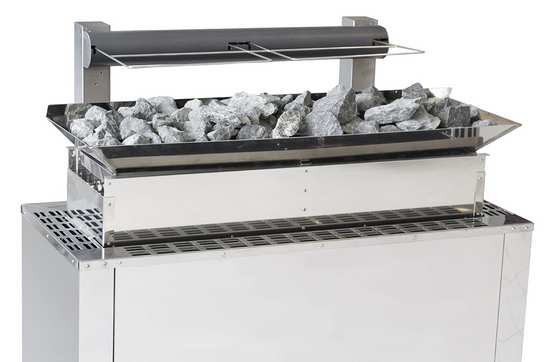 - Saunasteine ohne Kontakt mit Heizstäben. Innovative V-Lamellen unter dem Steinkorb dienen als Auffangwanne für Aufgusswasser und gewährleisten dabei den Durchsatz der heißen Luft.