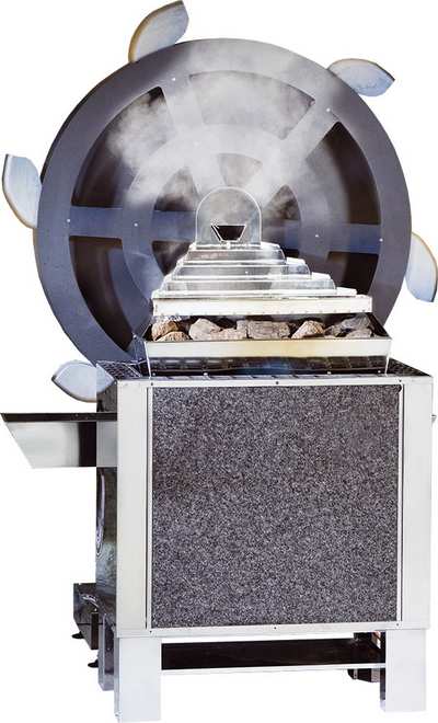 Das Mühlenrad dreht sich im Betrieb langsam gegen den Uhrzeigersinn und wird damit schon zum Blickfang in jeder Sauna. Nach dem automatischen Signal dreht sich das Rad in die Gegenrichtung, so dass die Schaufeln das Wasser direkt auf die Kaskade über dem Ofen bringen und für eine Serie von effektvollen, kräftigen Aufgüssen sorgen. Das große Steinvolumen sorgt für eine besonders gleichmäßige Strahlungswärme und großes Wärmespeichervermögen.