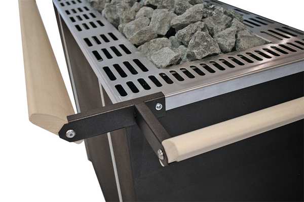 Zubehör: Ofenschutz-Halterung für die Montage eines Ofenschutzes am Saunaofen bzw. Halterung mit Schutzreling aus Abachi Holz.