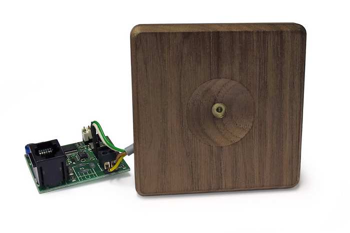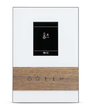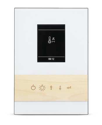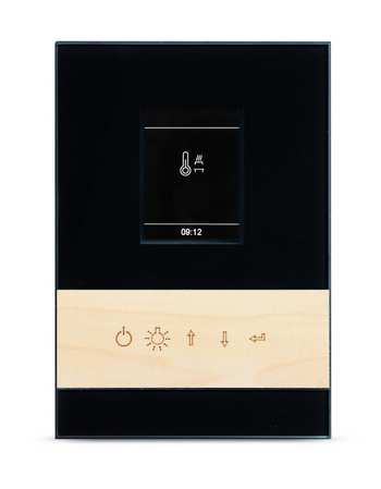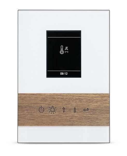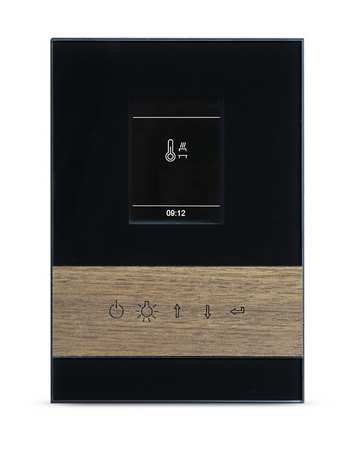 Exklusives Bedienteil mit Frontseite komplett aus Glas, mit stilvoller Einlage aus Echtholz (Ahorn oder Nussbaum) sowie separatem Leistungsteil und kapazitiven Tasten.