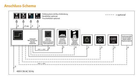 - Feuchteregelung – zeitproportional (ermöglicht konstante Dampfproduktion) bzw. mit optionalem Feuchtefühler nach relativer Luftfeuchte (exakte Feuchteregelung nach rel. Luftfeuchte).